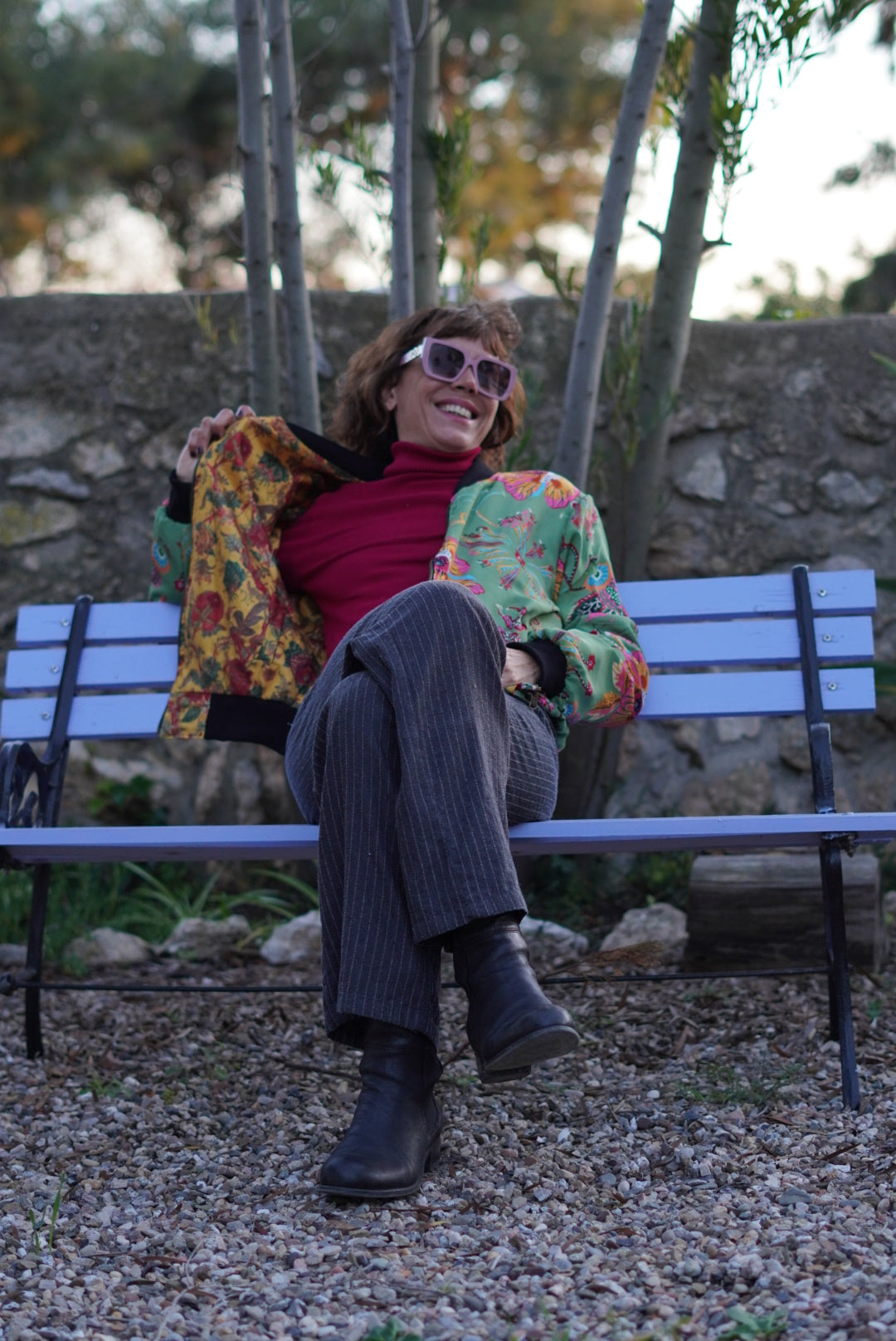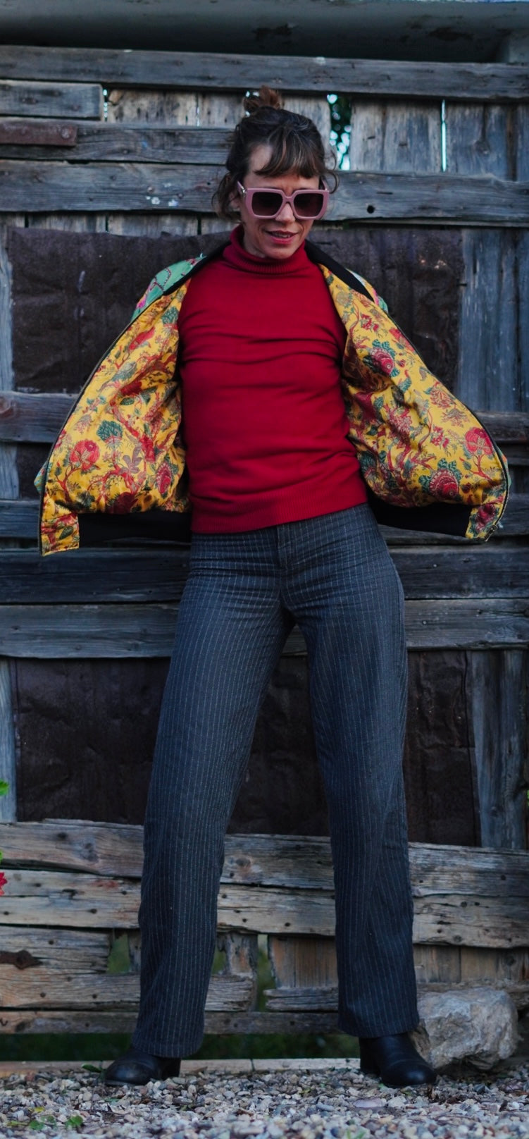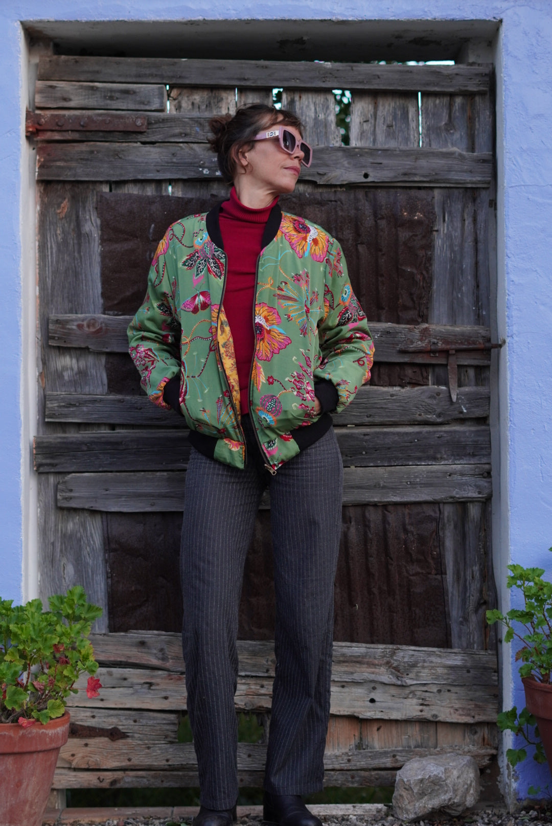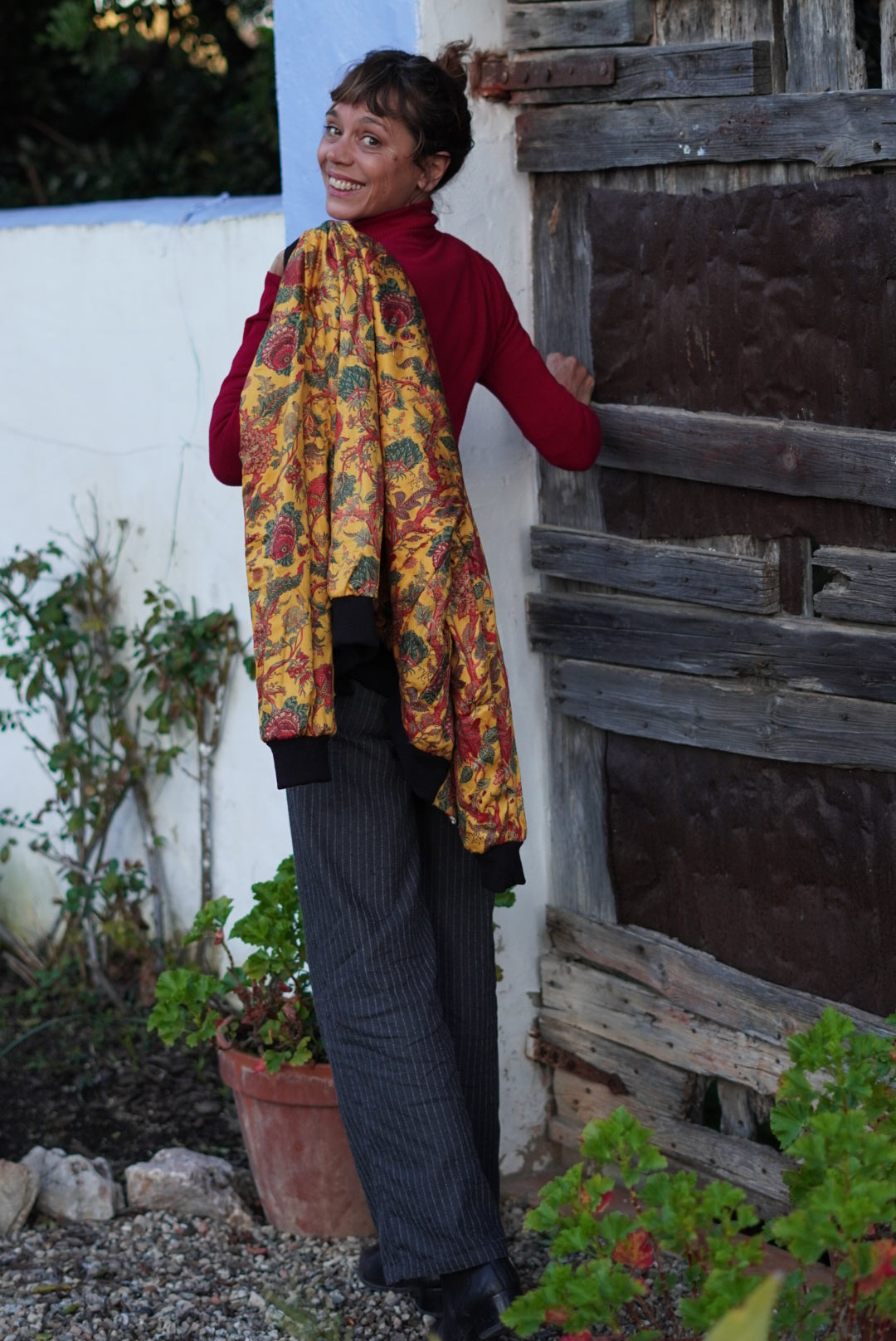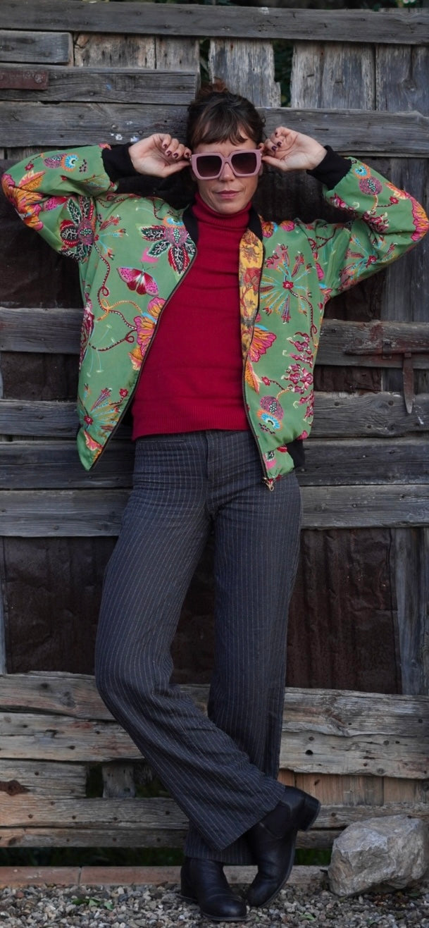 Esta bomber única combina estilo y versatilidad. Por un lado, su exterior en seda verde con un vibrante estampado de mariposas y flores aporta un toque elegante y sofisticado. Por el otro, su interior de algodón con un delicado diseño floral en tonos mostaza ofrece una opción más cálida y relajada.