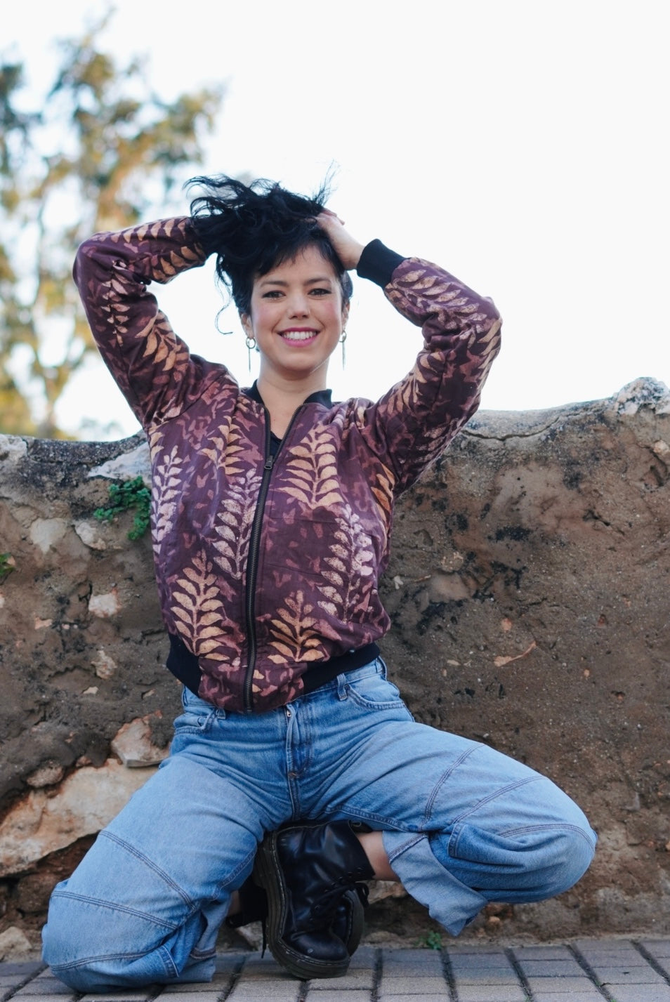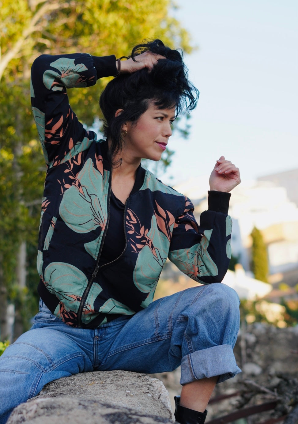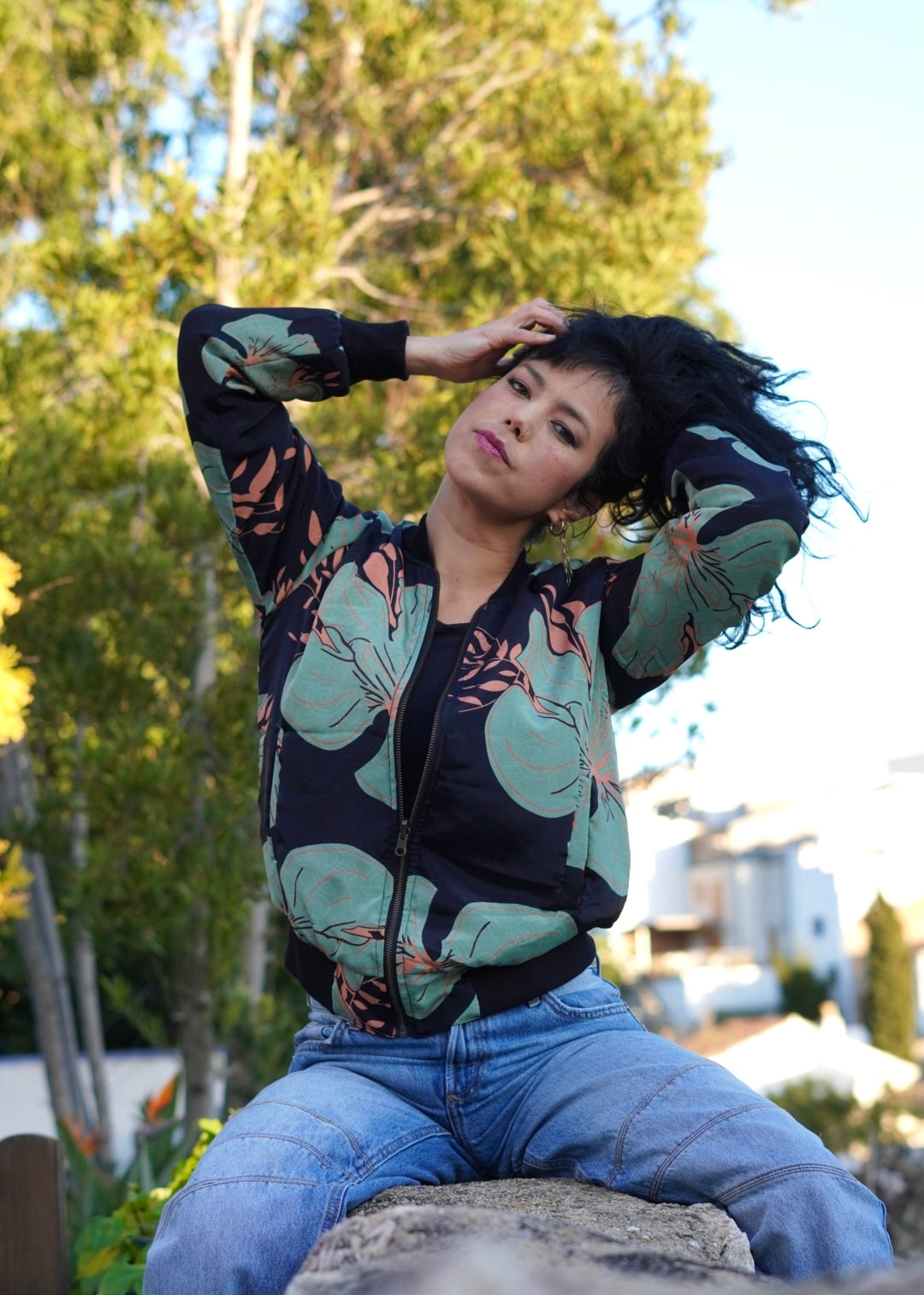 Esta chaqueta combina elegancia y frescura en una sola prenda. Su exterior en seda estampada luce un diseño botánico con hojas tropicales en verdes y coral sobre fondo oscuro, mientras que su interior de algodón ofrece un estampado floral en tonos cálidos.