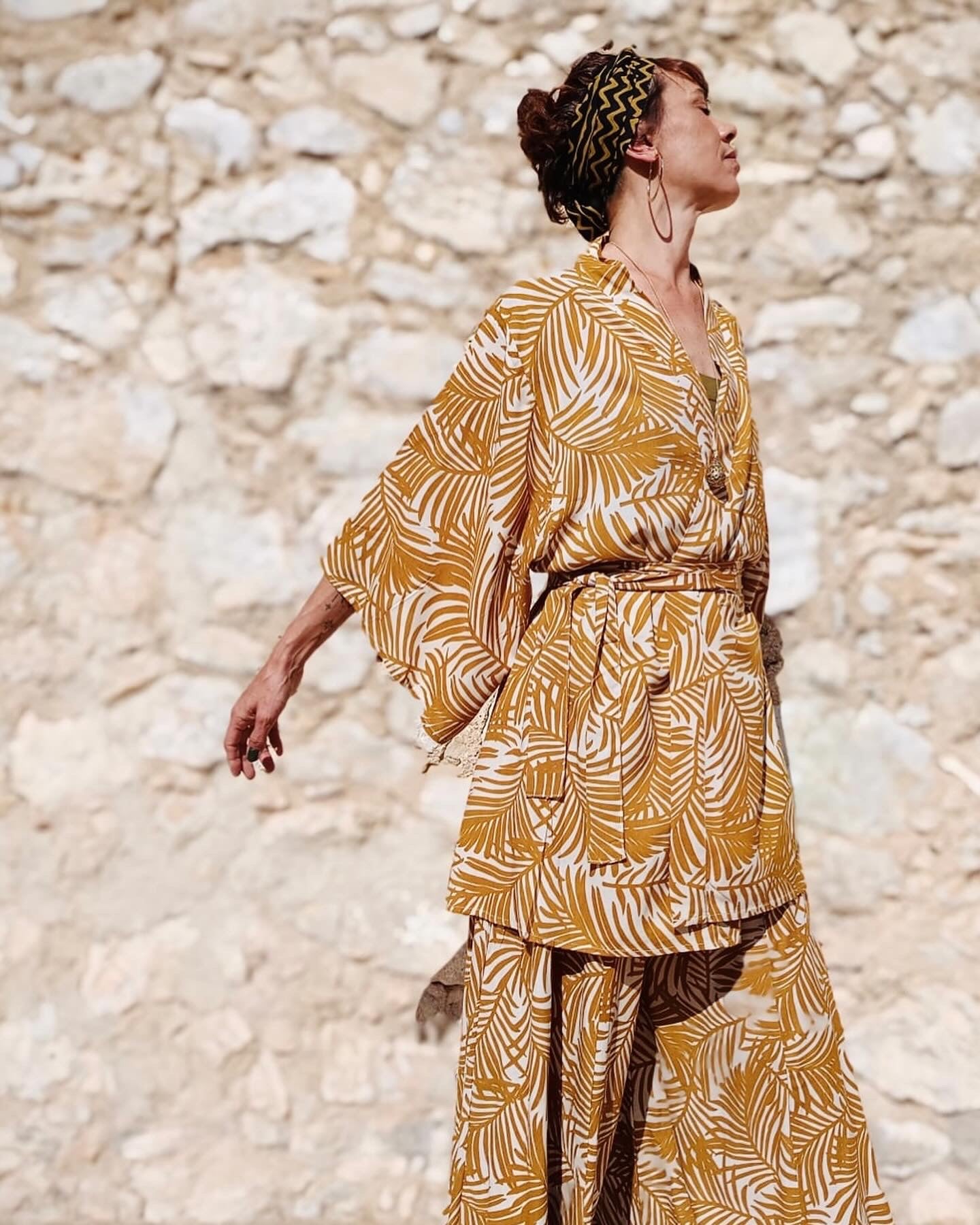 Kimono manga ancha , tejido Rayon estampado color mostaza . Ideal para verano y si lo usas con el cinturón queda como un vestido corto . Talla Única