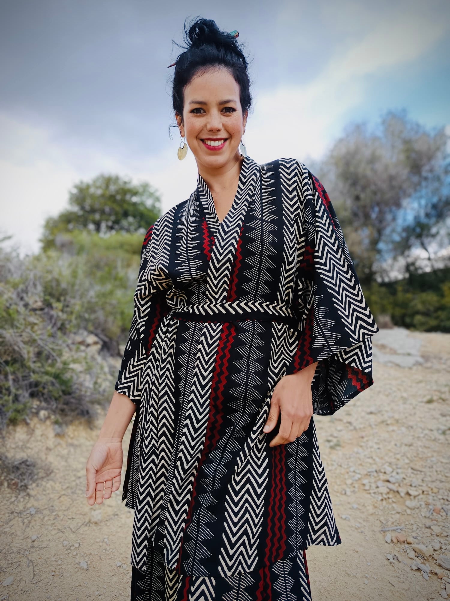 Kimono manga ancha . Tejido Rayon . Talla Única ideal para ir a la playa o cómo vestido si lo usas con el cinturón del mismo estampado .